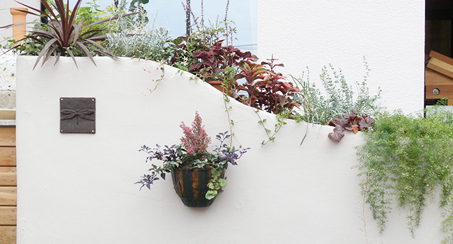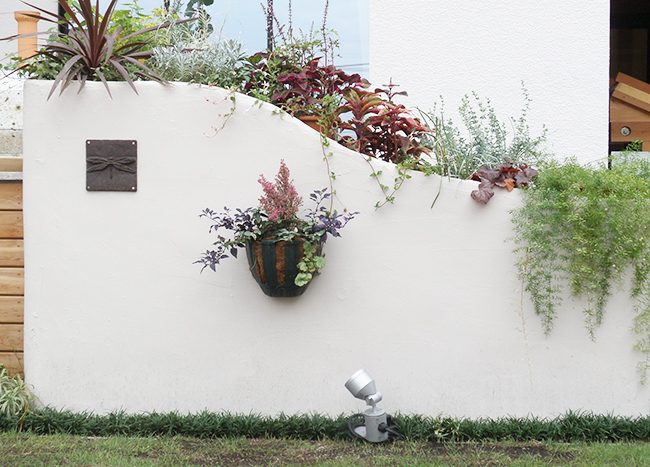 単調な植込みになってしまわないよう、ウォールには植木鉢がそのまま入る程度の厚みの空洞をもうけ、気軽に季節の植物を入れ替えることを提案しています。これなら、植物のもつ色合いと形状を立体的にデザインしやすいですし、隣地境界などにも応用が可能なアイディアです。