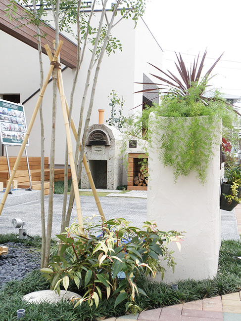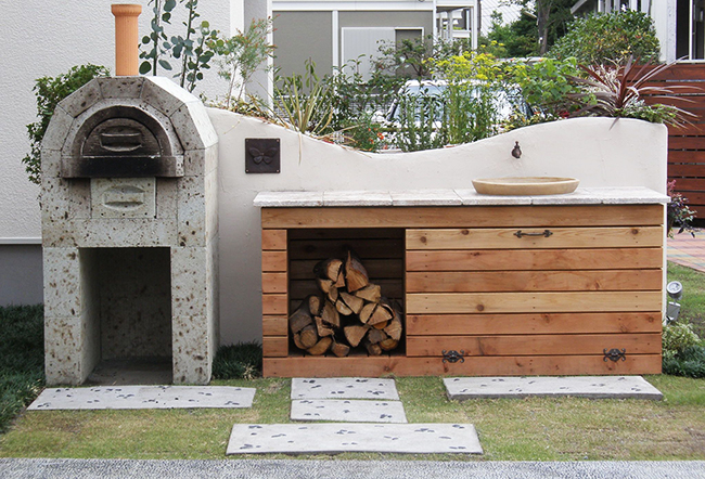 さらに、ウォールと一体的に大谷石を使用した薪で焼き上げる本格的なピザ釜とキッチンも設けました。楽しい笑い声が響くような家族や仲間との週末を提案しています。