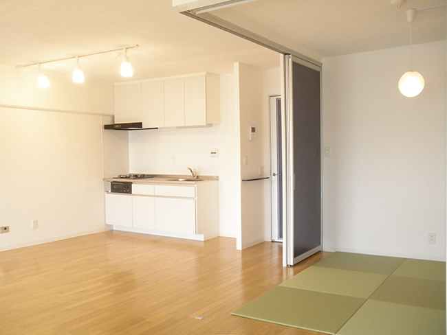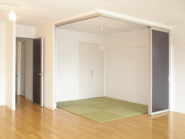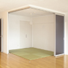 個室重視のレイアウトから間仕切り壁を取り払いました。書斎とワーキングルームを最小限に、残りはワンルームでゆったりと開放的に。開閉できるアクリル素材の間仕切りと敷畳で落ち着ける和の空間を設けながら、抜けの良い広がりをもつモダンでシンプルなデザインで全体をまとめました。