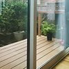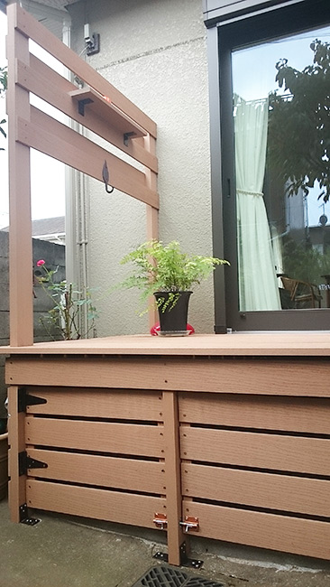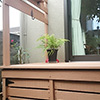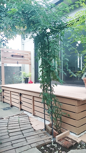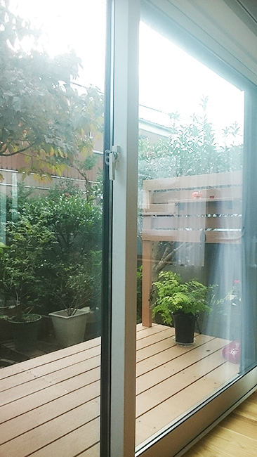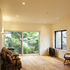 このリビング南面には窓からは床と同じ高さで張り出すようにウッドデッキを設け、視覚的な広がりを演出しています。道路との境にはフェンスを設けることで、安心感とほどよいプライバシーを保つことができます。