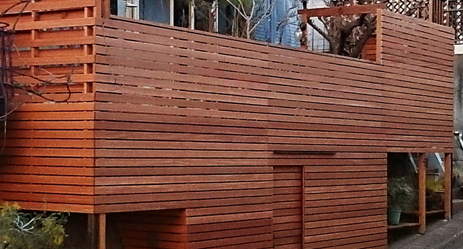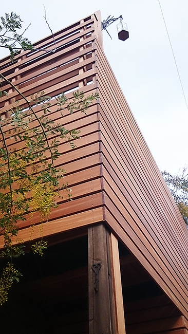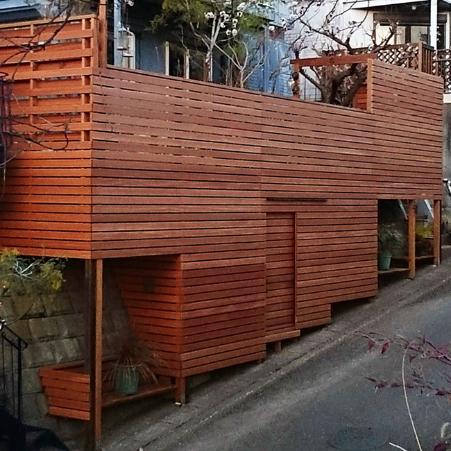 この敷地には高低差があるため、庭側は道路から見上げるくらいの高さにあります。今回、デッキの増設には地面から支える構造が必要となりましたが、逆にそれらを積極的に生かす手法をとっています。